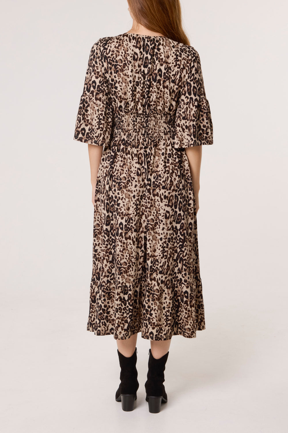 Leopard Print Elasticated Neck Shirred Waist Midi Dress